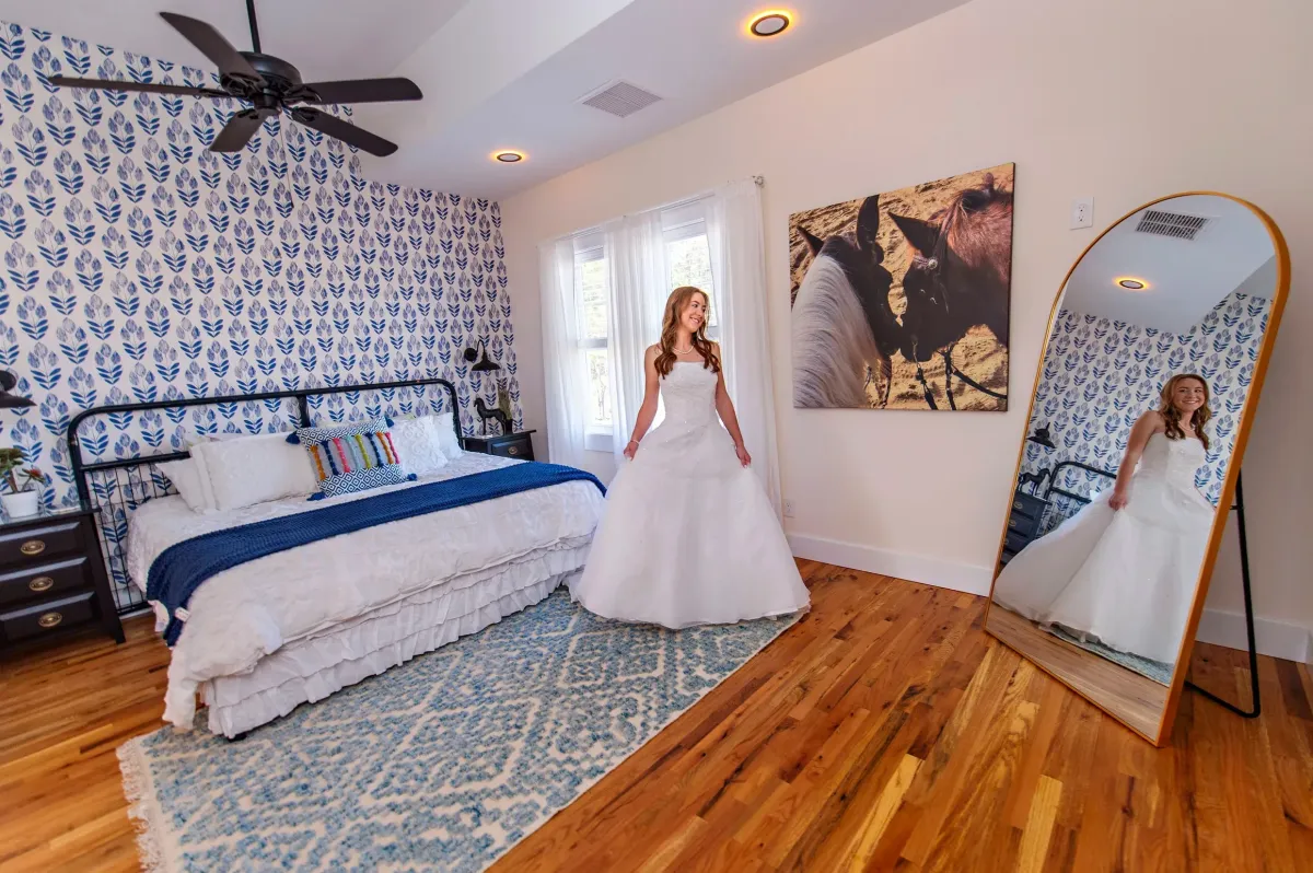 Our bridal suite offers a quiet, beautiful space for pre-ceremony preparations. With rustic details, large windows overlooking the farm, and warm lighting, it’s a perfect place for those special getting-ready moments. Relax and savor this peaceful time before stepping into your wedding celebration. And just a short walk away, our Groom’s Quarters provides a comfortable, private space for the groom and his party to prepare and enjoy the excitement of the day.